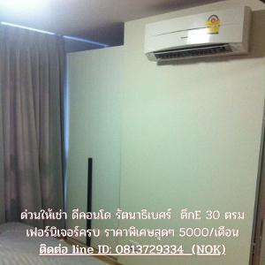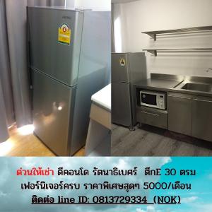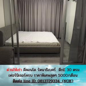 ให้เช่าด่วน ดีคอนโด รัตนาธิเบศร์ MRT ไทรม้า 30 ตรม. ตึก E เฟอร์ครบ พร้อมอยู่ ขนาด 30 ตร.ม. สตูดิโอ 1 ห้องน้ำ ตึก E ห้องสภาพดี พร้อมอยู่ทันที เฟอร์นิเจอร์และเครื่องใช้ไฟฟ้าอ้างอิงตามรูป (มีเตียง ฟูก ตู้เสื้อผ้า ชั้นวางทีวี ทีวี แอร์ ผ้าม่าน โซฟา ตู้เย็น ไมโครเวฟ ผักบัวอาบน้ำ อ่างล้างจาน) เรียกว่ามีกระเป๋าใบเดียวเข้าอยู่ได้เลย !! สิ่งอำนวยความสะดวก สระว่ายน้ำ,ฟิตเนส,รปภ., กล้องวงจรปิดโครงการ, ประตู Key Card,สวนหย่อม,Wi-Fi Internet บริเวณ Lobby (ฟิตเนส และสระว่ายน้ำ) ใกล้ MRT สถานีไทรม้า สนใจให้ไวเลย !! ** ให้เช่าราคาถูกพิเศษวันนี้สำหรับคุณที่ 5,000 บาทต่อเดือน วางเงินประกัน 2 เดือน ค่าเช่าล่วงหน้า 1 เดือน เข้าอยู่ได้เลย นัดหมาย ดูห้อง เอาจริง ติดต่อมาที่ Nok : 081-372-9334 Line id : 0813729334
