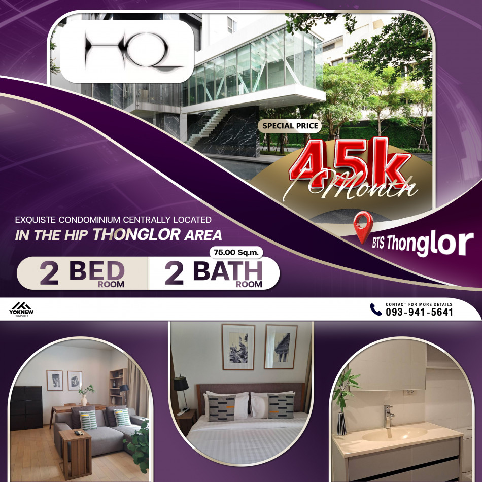 คอนโด HQ Thonglor 2 ห้องนอน 2 ห้องน้ำ ห้องเฟอร์นิเจอร์ครบ เช่าราคา 45,000 บาท